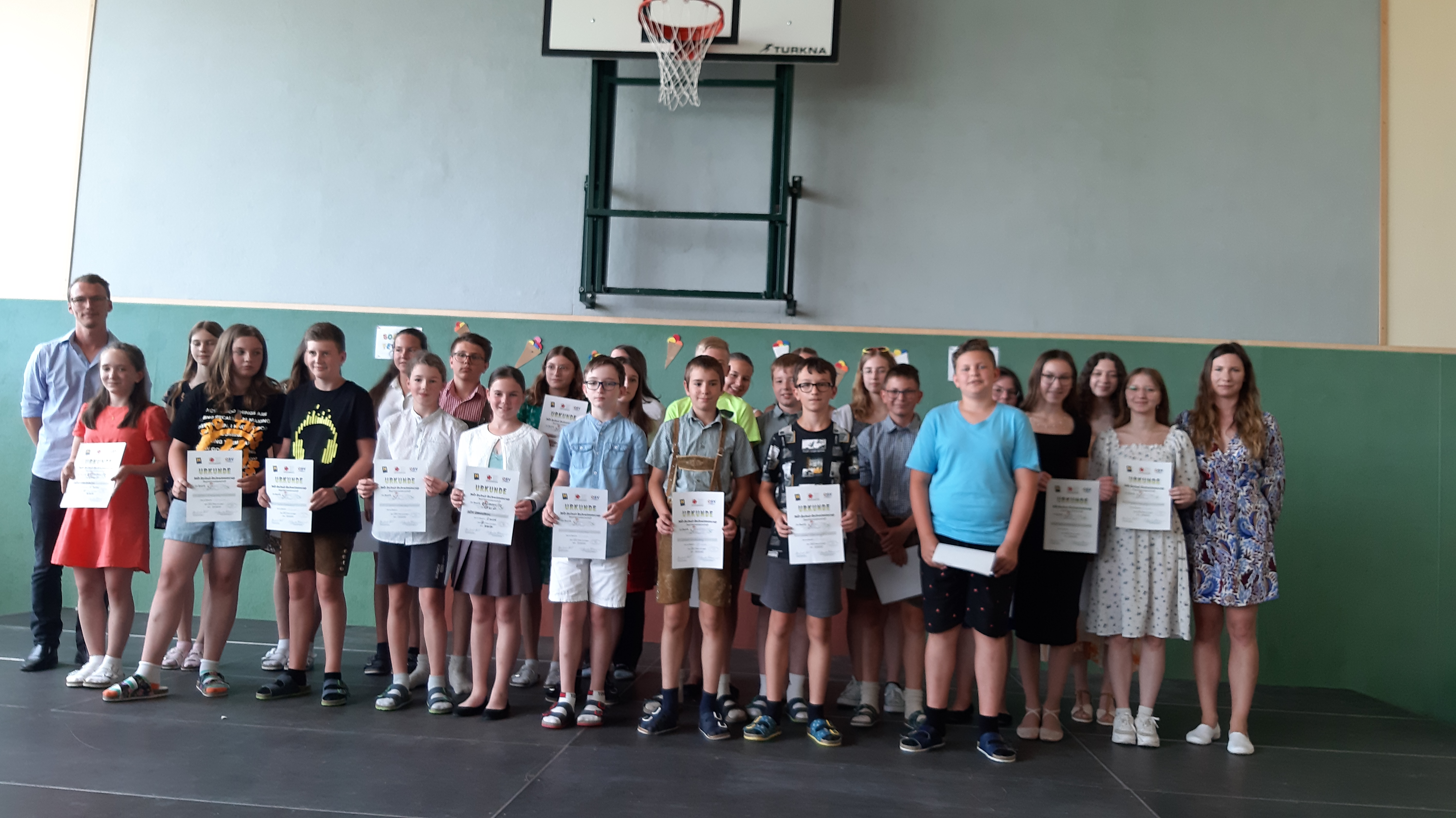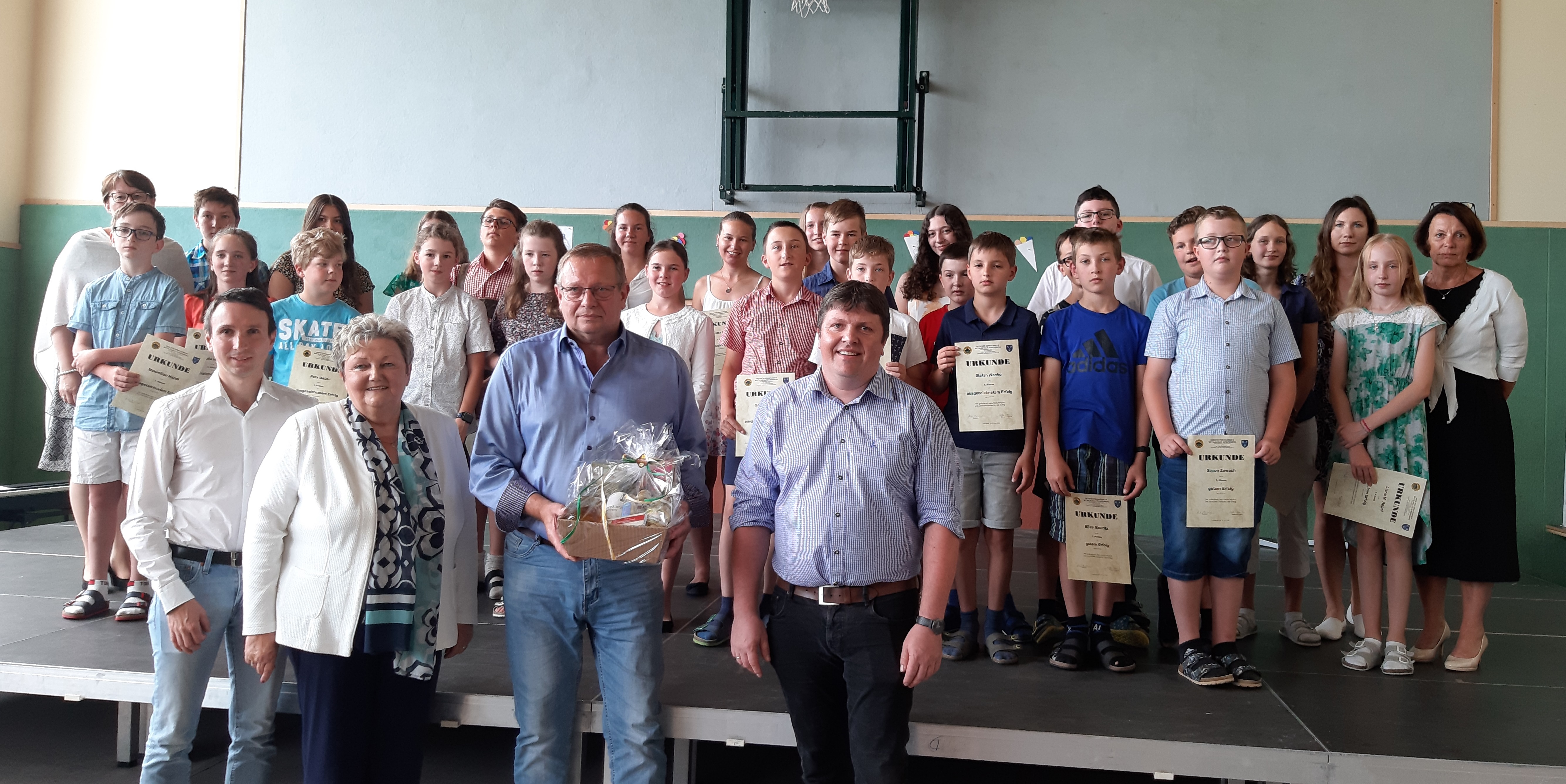 Dir. Anita Fröhlich gratulierte zum Abschluss auch allen Schülerinnen und Schülern zu ihren Zeugnissen und dankte den Lehrerinnen und Lehrern für ihre ausgezeichnete Arbeit und den Eltern für die gute Zusammenarbeit und Unterstützung das ganze Jahr, besonders auch den Elternvereinen. 20 Kinder der Mittelschule dürfen sich über einen ausgezeichneten Erfolg freuen, 7 Kinder erreichten einen guten Erfolg. Sie alle erhielten von ihren Klassenvorständen Urkunden.