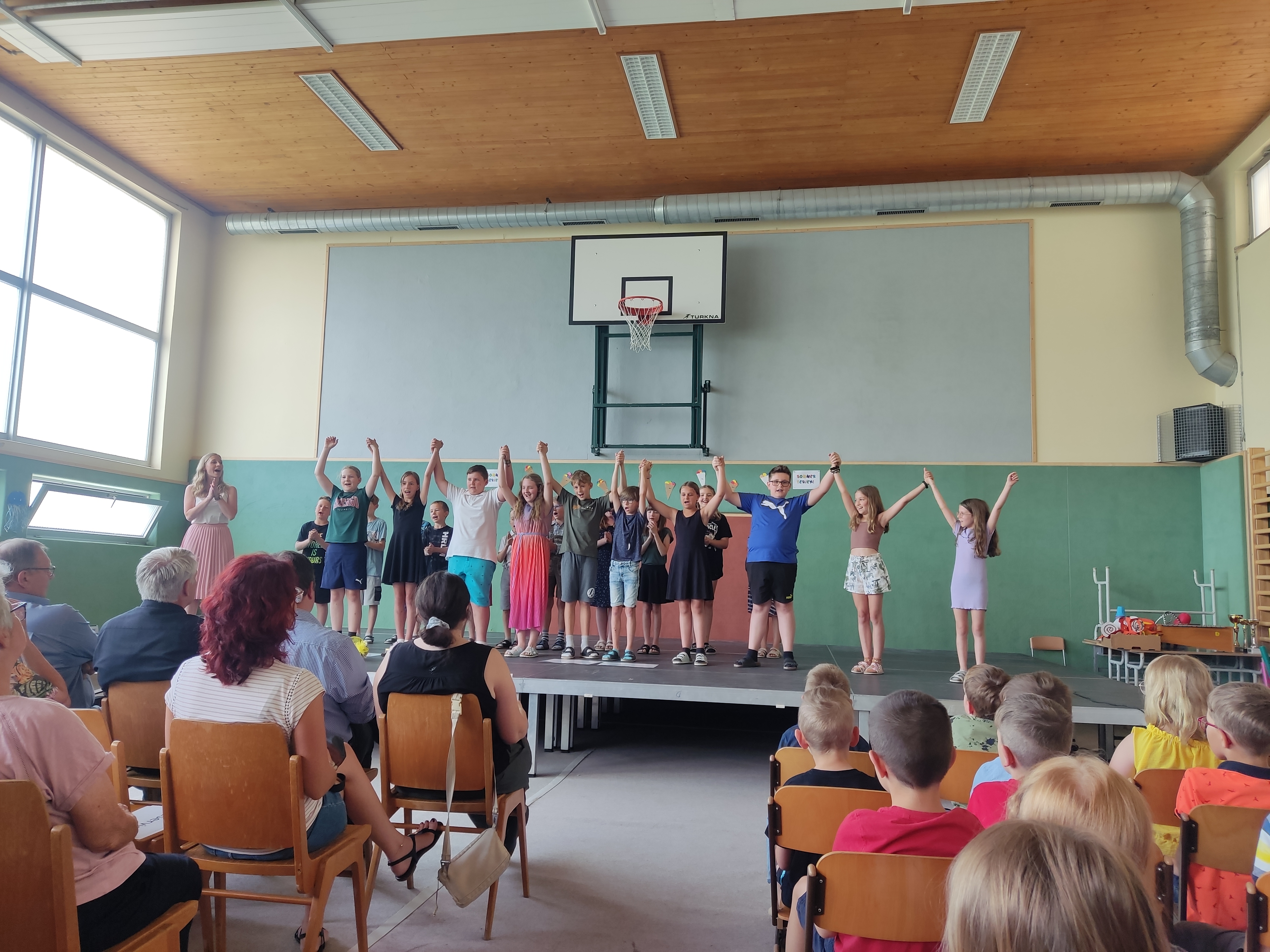 Die Kinder der 4. Klasse Mittelschule hatten sich am Donnerstag bereits in einer gelungenen Feierstunde von den Lehrerinnen und Lehrern verabschiedet und präsentierten am Schulschluss noch einmal den Cup – Song.