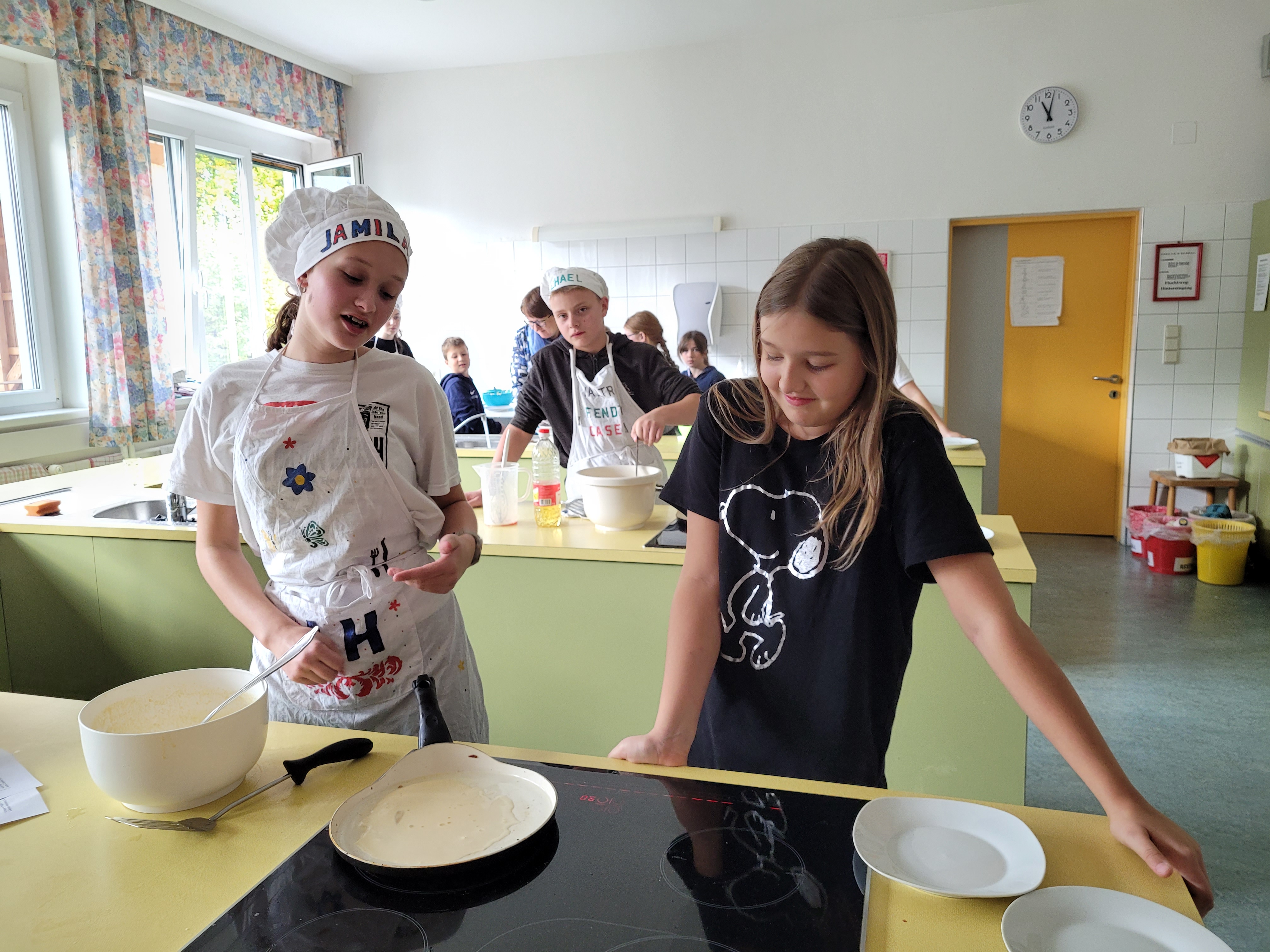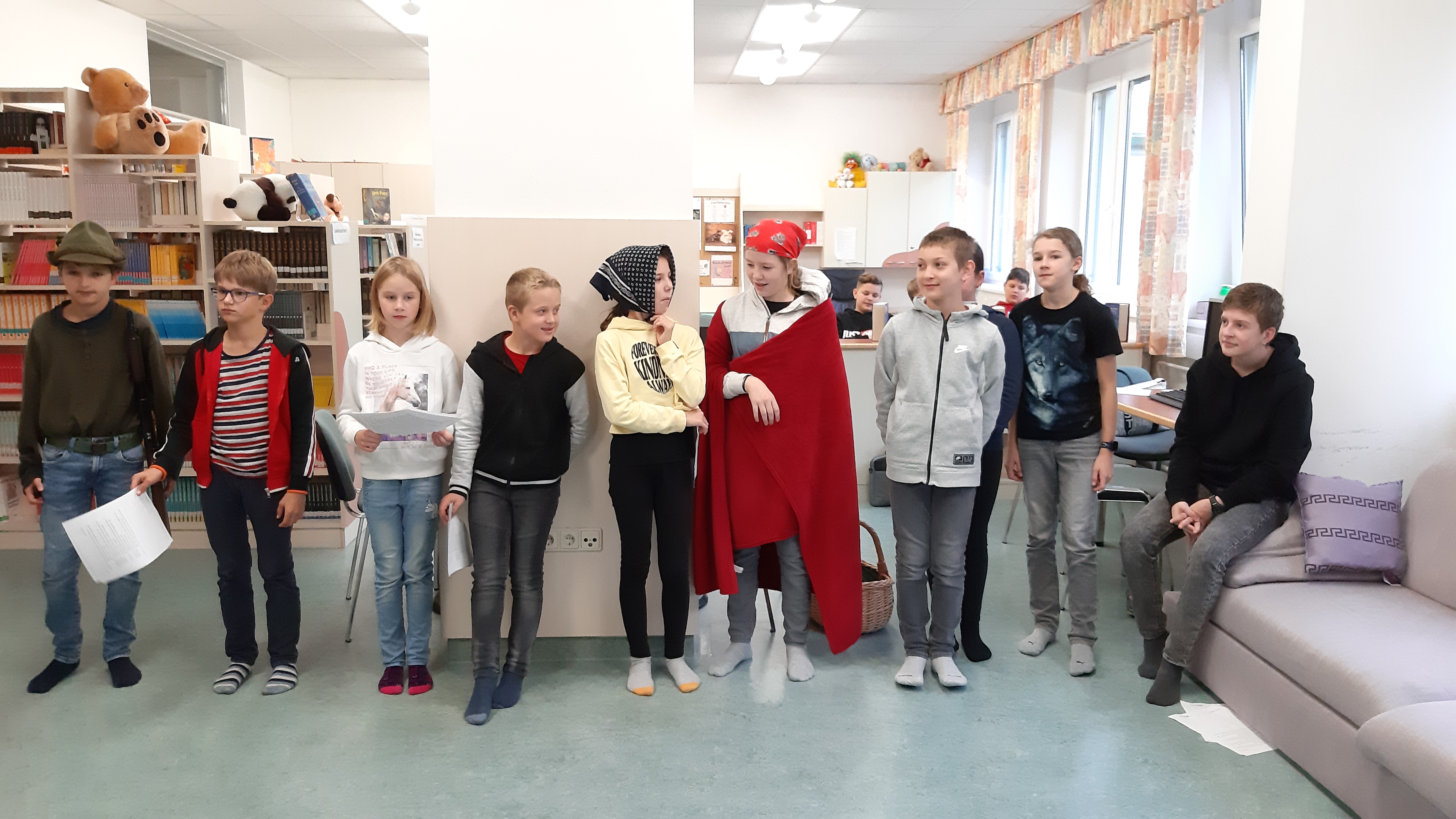 In der Bibliothek stand das Theaterspielen in Form des Märchens „Rotkäppchen“ im Vordergrund. Zwischendurch konnten sich die Kinder in der Schulküche stärken – hier durften sie sich Palatschinken, Waffeln und Obstspieße herstellen.