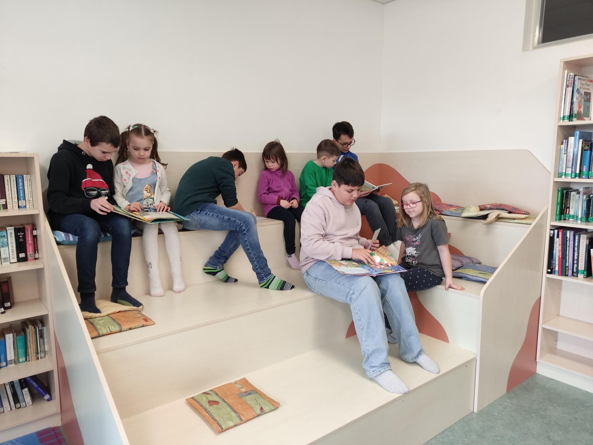 Auf dem Foto: Die Kindergartenkinder mit Kindergartenleiterin Cornelia Matousek sowie die Mittelschulkinder der 3. Klasse mit ihrer Deutschlehrerin Helene Handl sowie Dir. Anita Fröhlich in der Schulbibliothek.