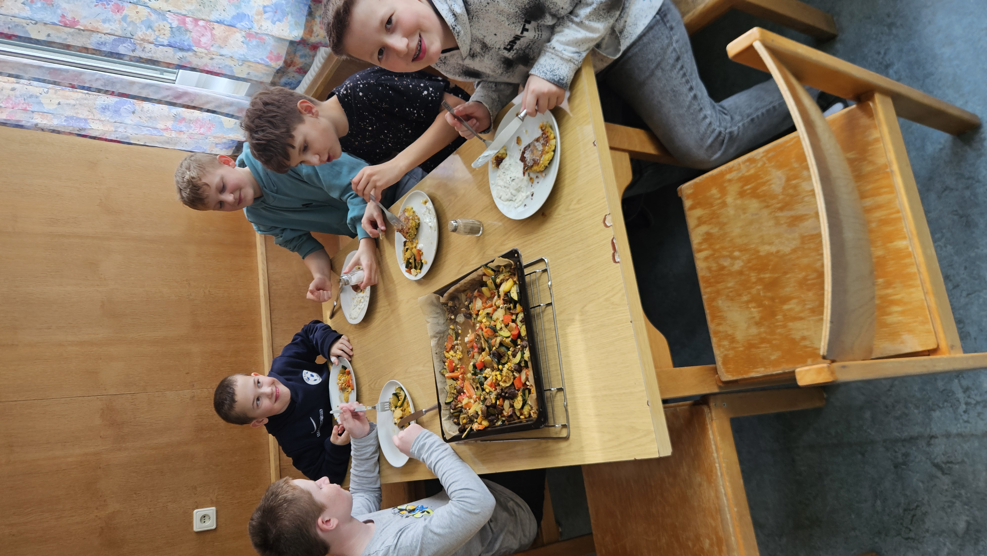 In der Themenwoche gab es für die Kochgruppe 2 der 3. Klasse ein gesundes Menü: Paprikaboote mit Crackern, Gemüseauflauf mit Kartoffeln und Obstspieße.