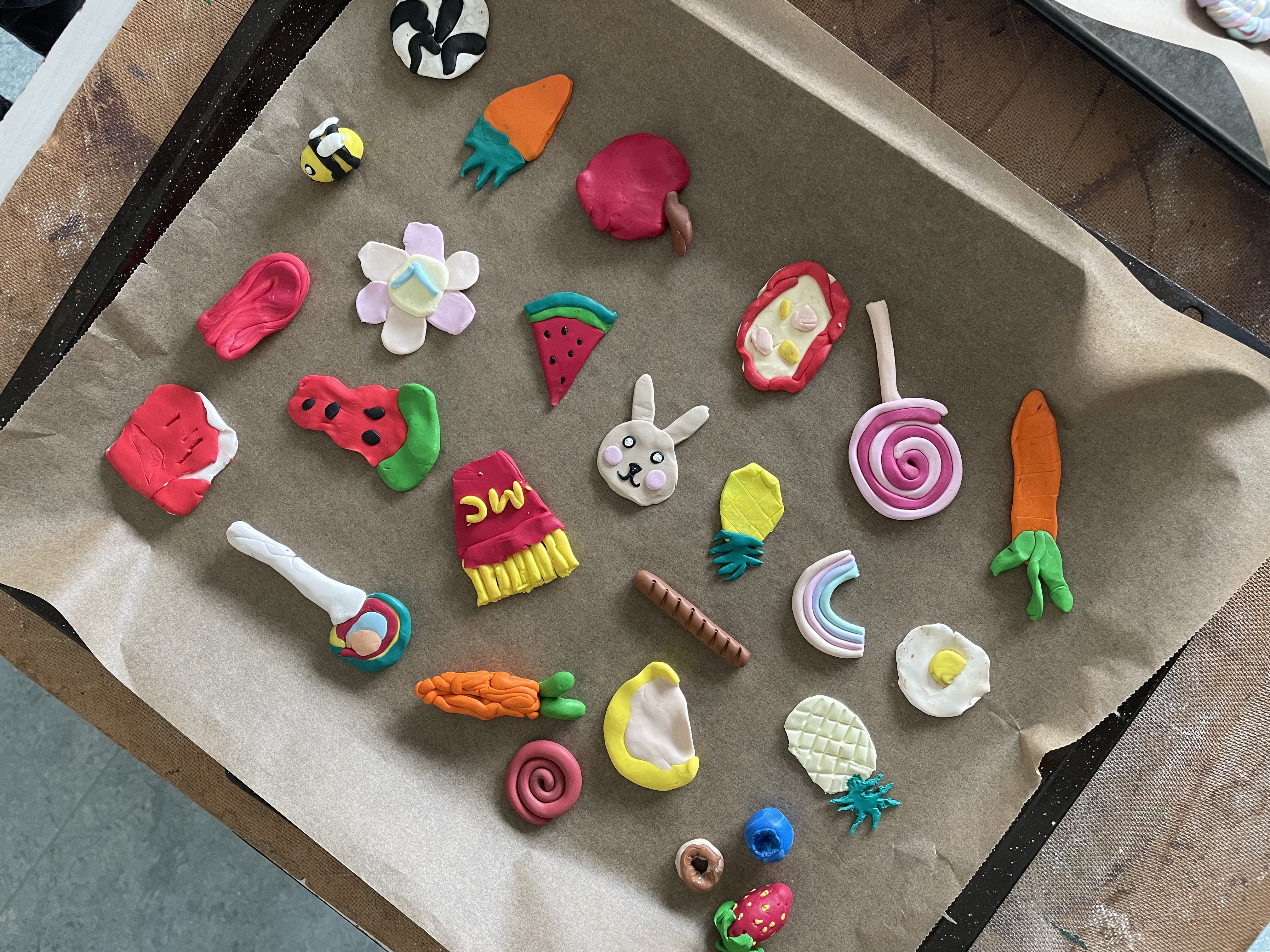 In Technik und Design gestalteten die Schüler:innen der 3. Klasse bunte Fimo-Magnete in Form gesunder Lebensmittel, die gebacken und glasiert wurden.