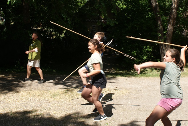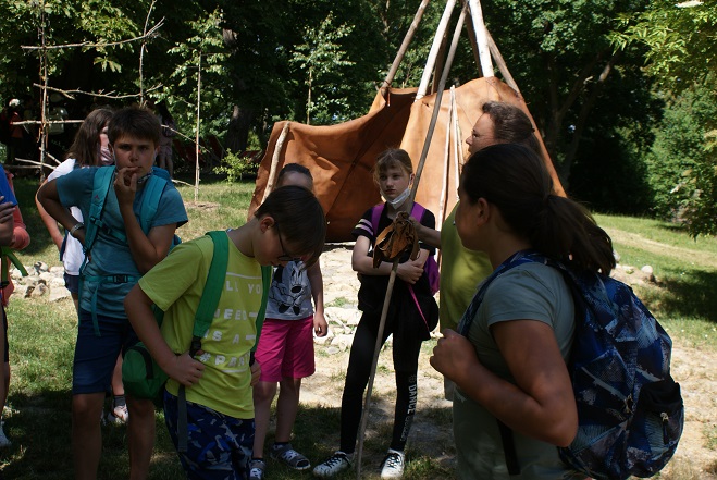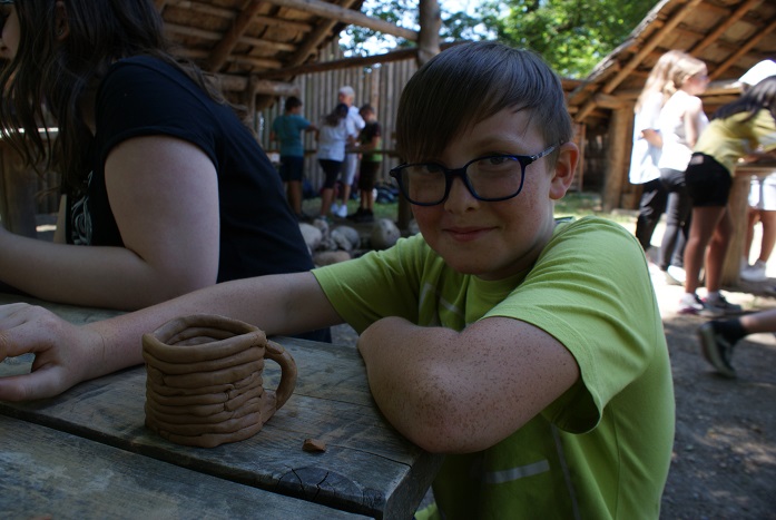 Neben dem Langhaus, einem Zelt, einer Schmiede und vielen anderen Gebäuden gab es auch den ersten Kühlschrank zu bestaunen. Beim Erlegen des Mammuts waren die Schüler leider nicht so erfolgreich, dafür konnten sie perfekt mit dem urgeschichtlichen Handy – genannt Schwirrholz – umgehen. ?