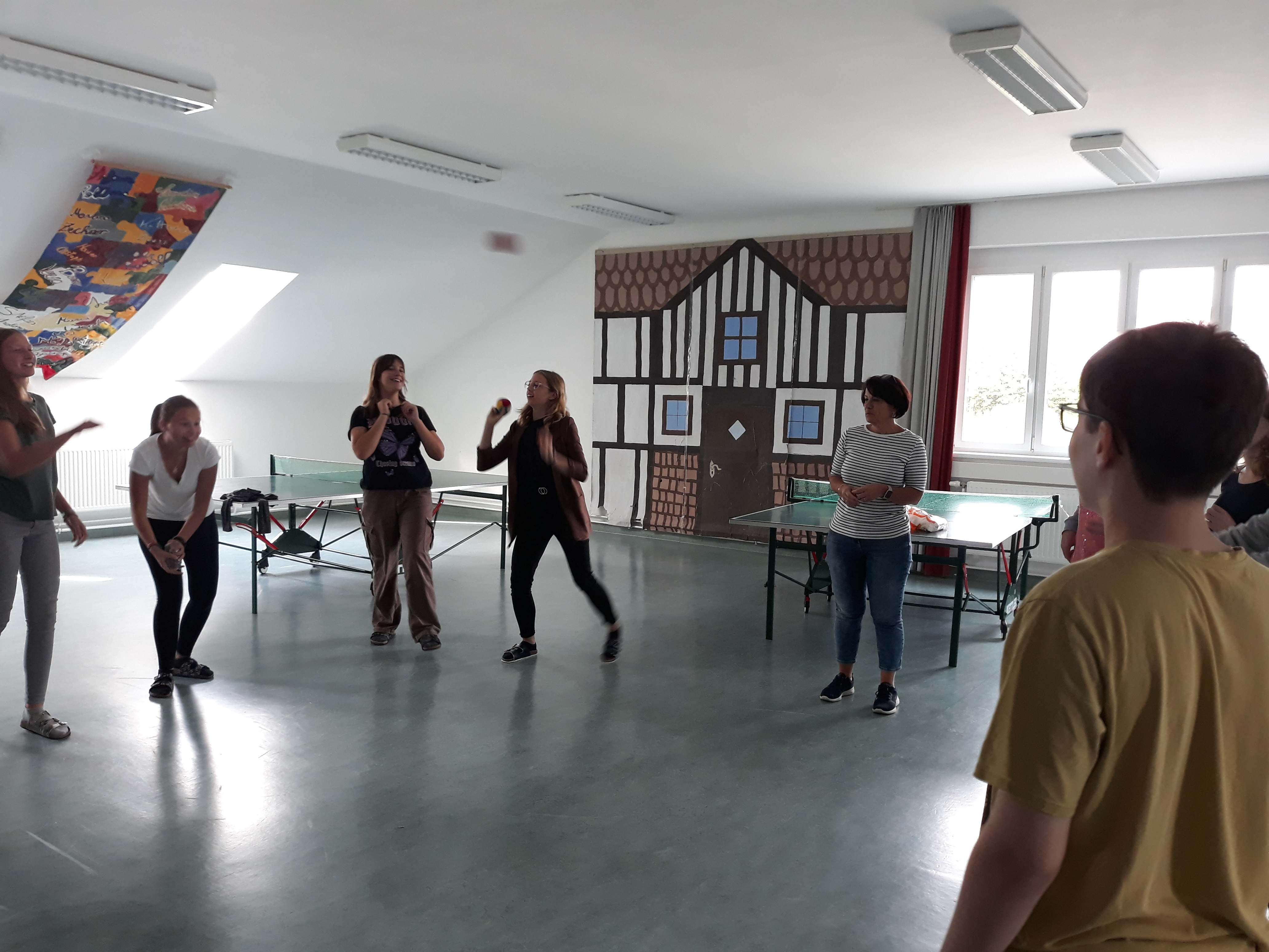 Zu Beginn mussten einige Aufgaben (gemeinsames Gehen mit einem Luftballon, Kreishocke, Sumpfmonster, ...) von der ganzen Klasse gemeinsam gelöst werden.