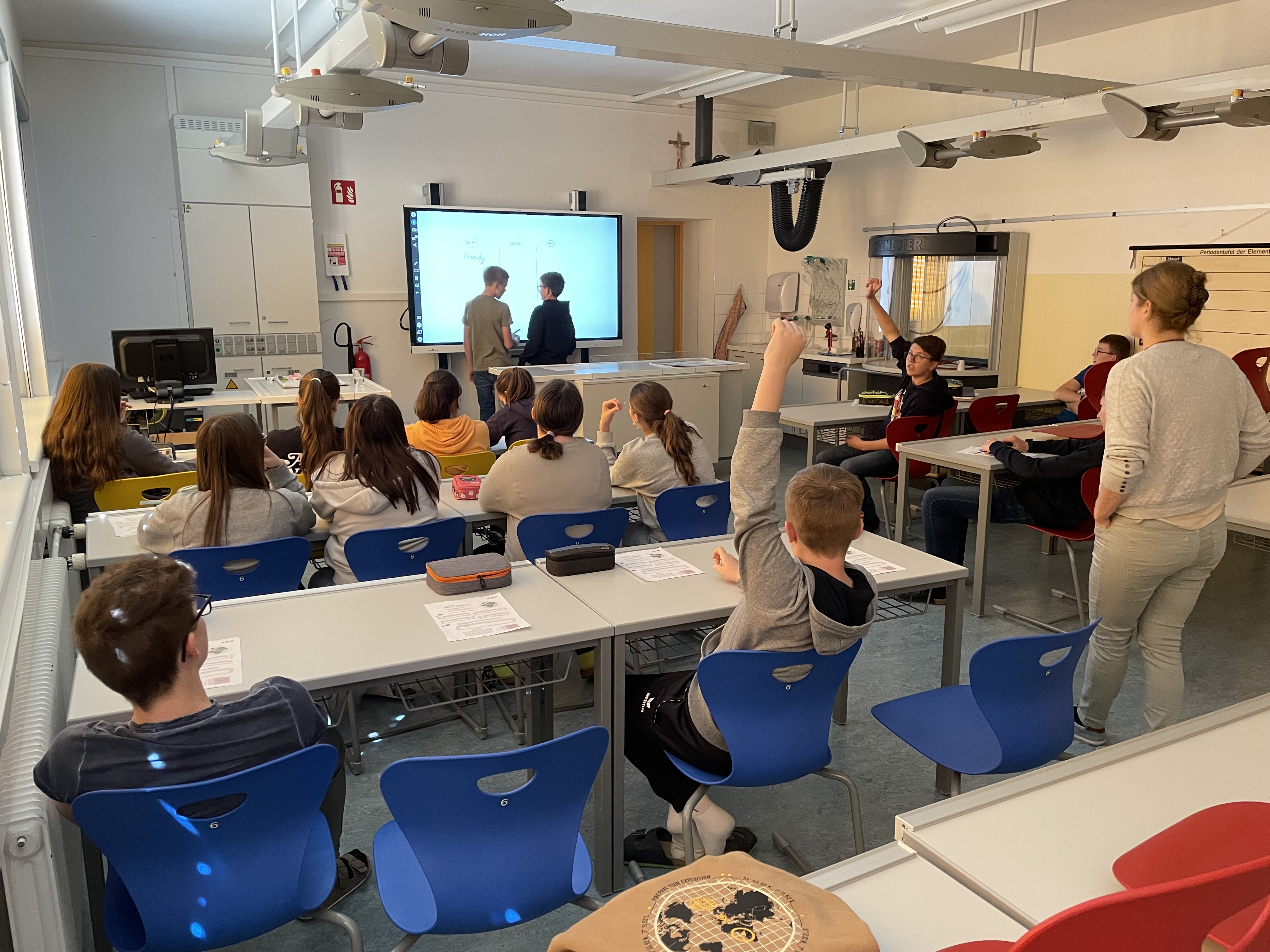 Gemeinsam mit den Schülerinnen und Schülern wurden die physikalischen Grundlagen zum Treibhauseffekt und die Unterschiede zwischen fossilen Energieträgern und erneuerbaren Energien erarbeitet. Dazu gehörten die Analyse des eigenen Flächenverbrauchs und CO2-Ausstoßes (Ökologischer Fußabdruck) im weltweiten Vergleich. Im letzten Teil standen eigene realistische Überlegungen, um nachhaltiger zu leben, im Vordergrund. Im Gepäck hatte Frau Weinkopf zur Demonstration auch ein aktuelles Klimaspiel, das verdeutlicht, dass jeder auch noch so kleine negative Beitrag zu Klima und Umwelt einer zu viel ist.