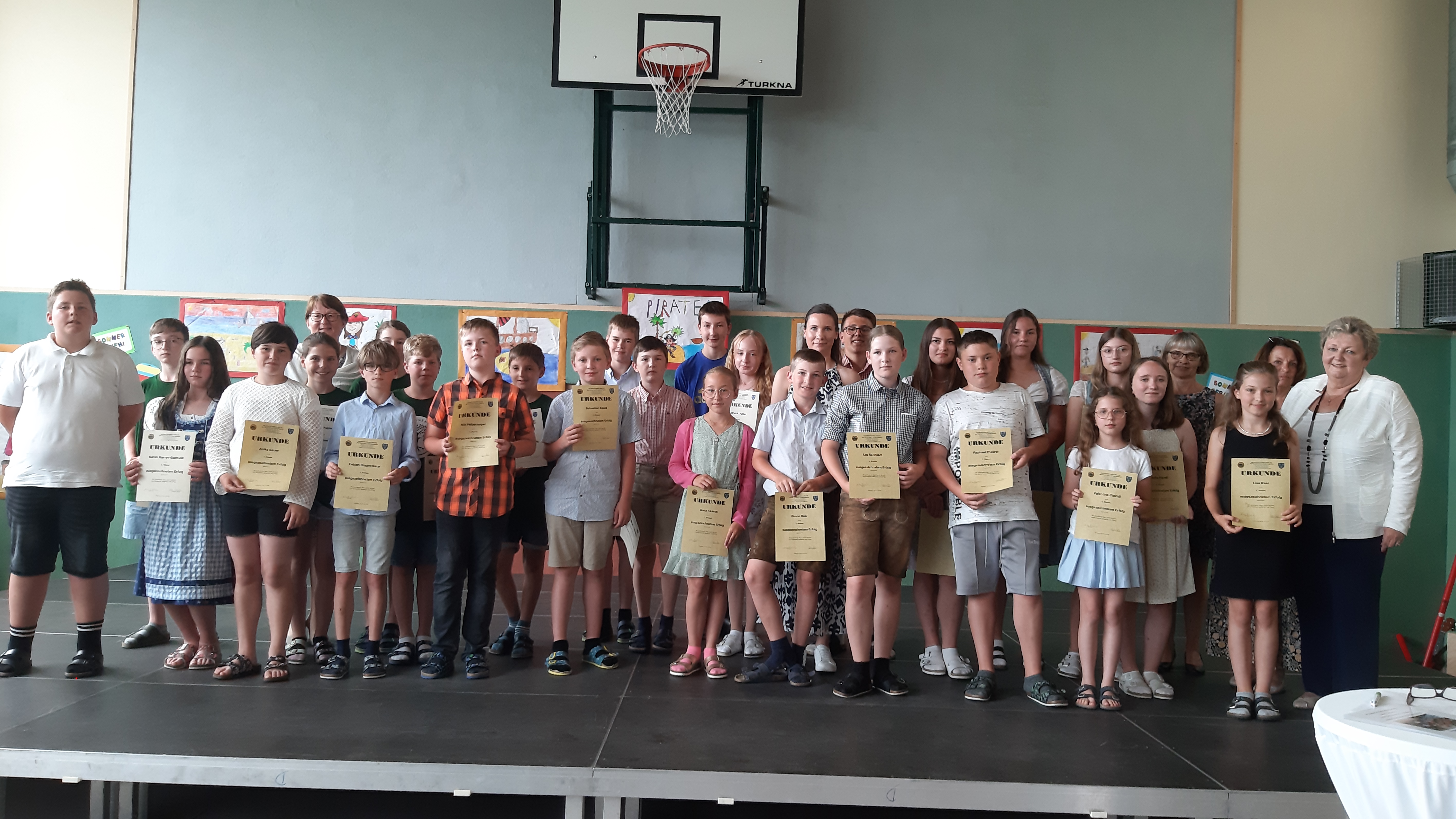 Dir. Anita Fröhlich gratulierte auch allen Schülerinnen und Schülern zu ihren Zeugnissen und dankte den Lehrerinnen und Lehrern für ihre ausgezeichnete Arbeit und den Eltern für die gute Zusammenarbeit und Unterstützung das ganze Jahr, besonders auch den Elternvereinen. Zahlreiche Kinder der Mittelschule durften sich über einen ausgezeichneten Erfolg freuen, sie erhielten von ihren Klassenvorständen die Urkunden.