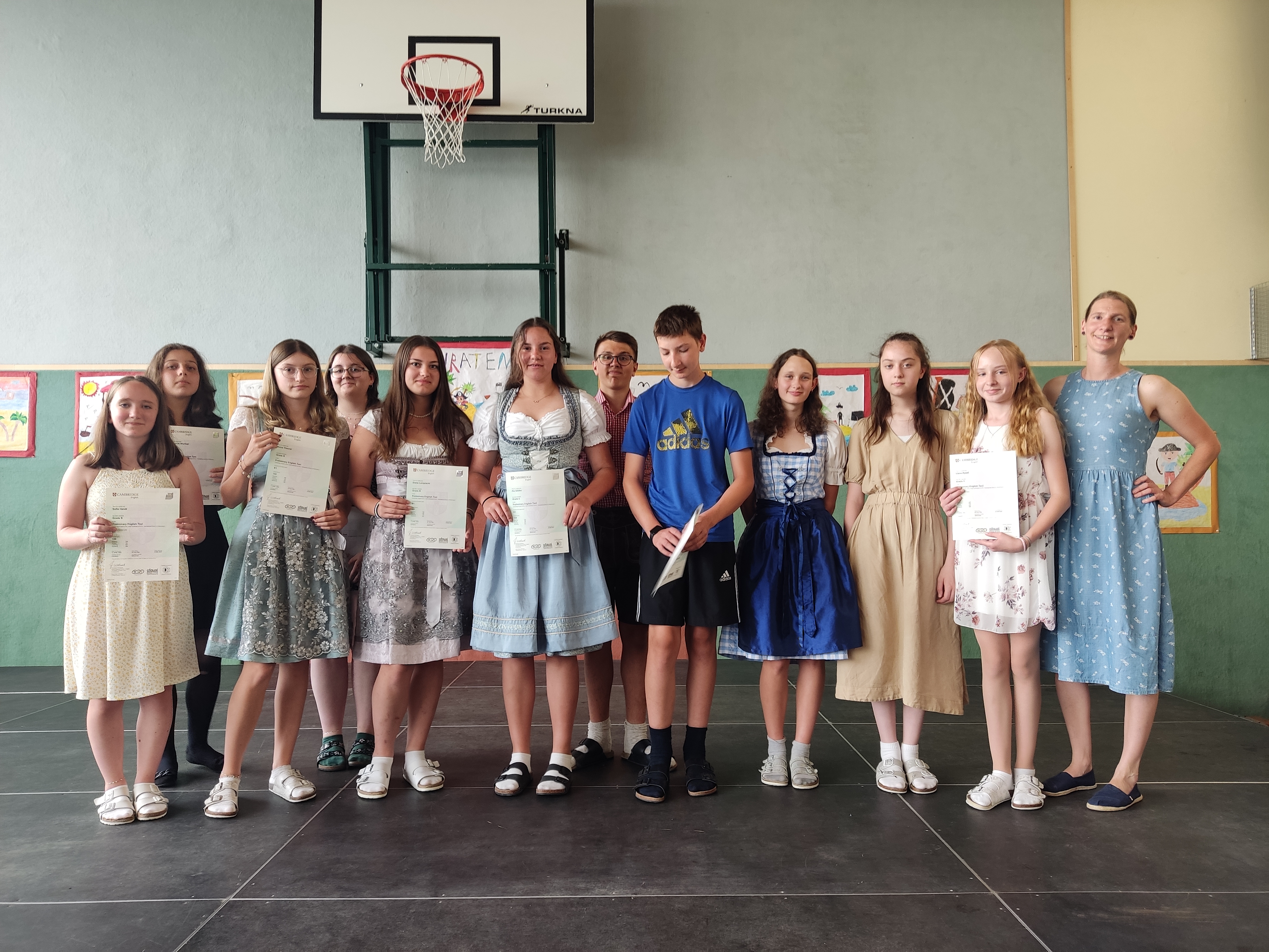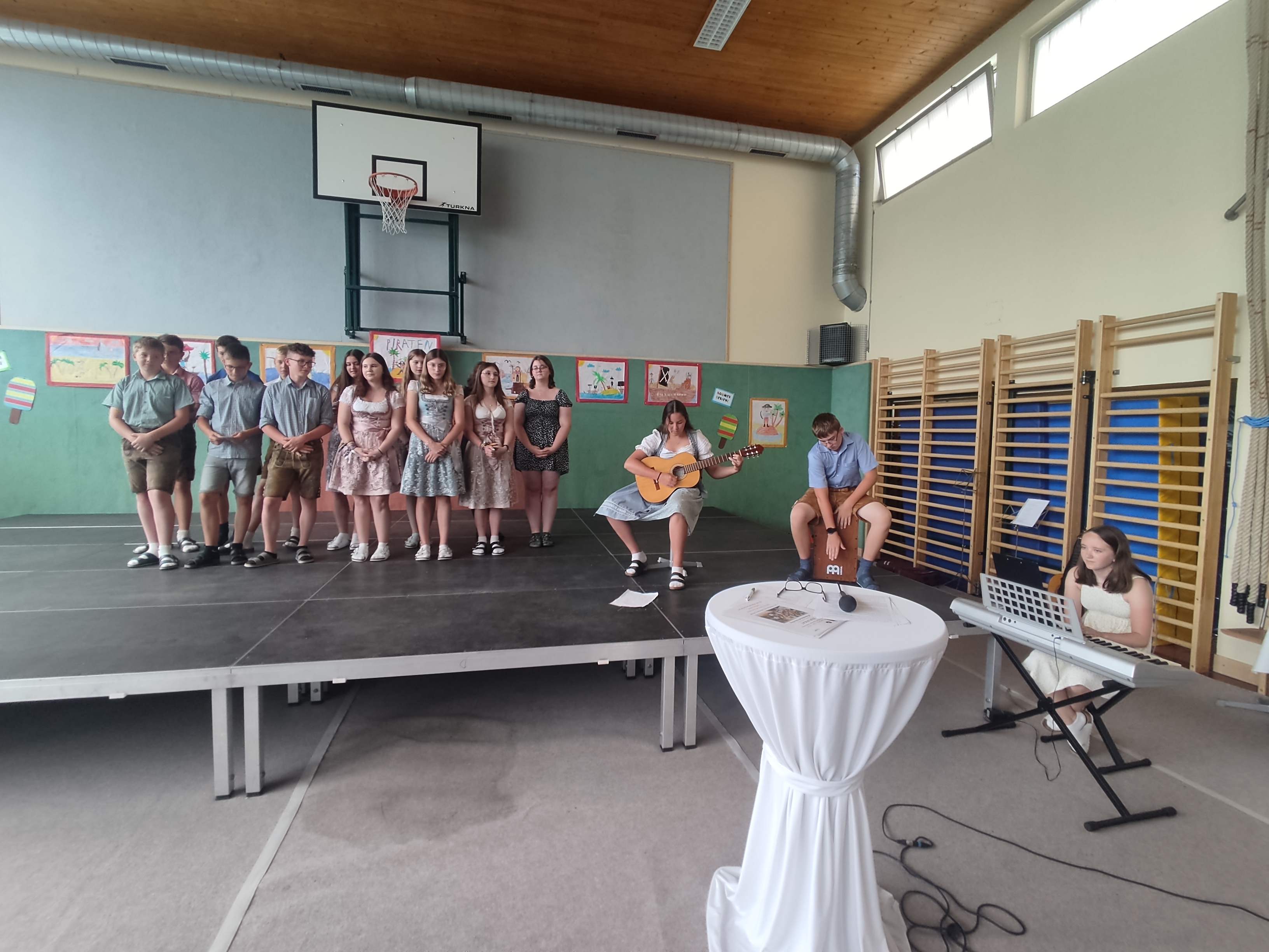 Musikalisch umrahmt wurde die Veranstaltung durch verschiedene Beiträge der Volks- und Mittelschulkinder. Die Kinder der 4. Klasse Mittelschule hatten sich am Donnerstag bereits in einer gelungenen Feierstunde von den Lehrerinnen und Lehrern verabschiedet und präsentierten am Schulschluss noch einmal das Lied „An Tagen wie diese“.