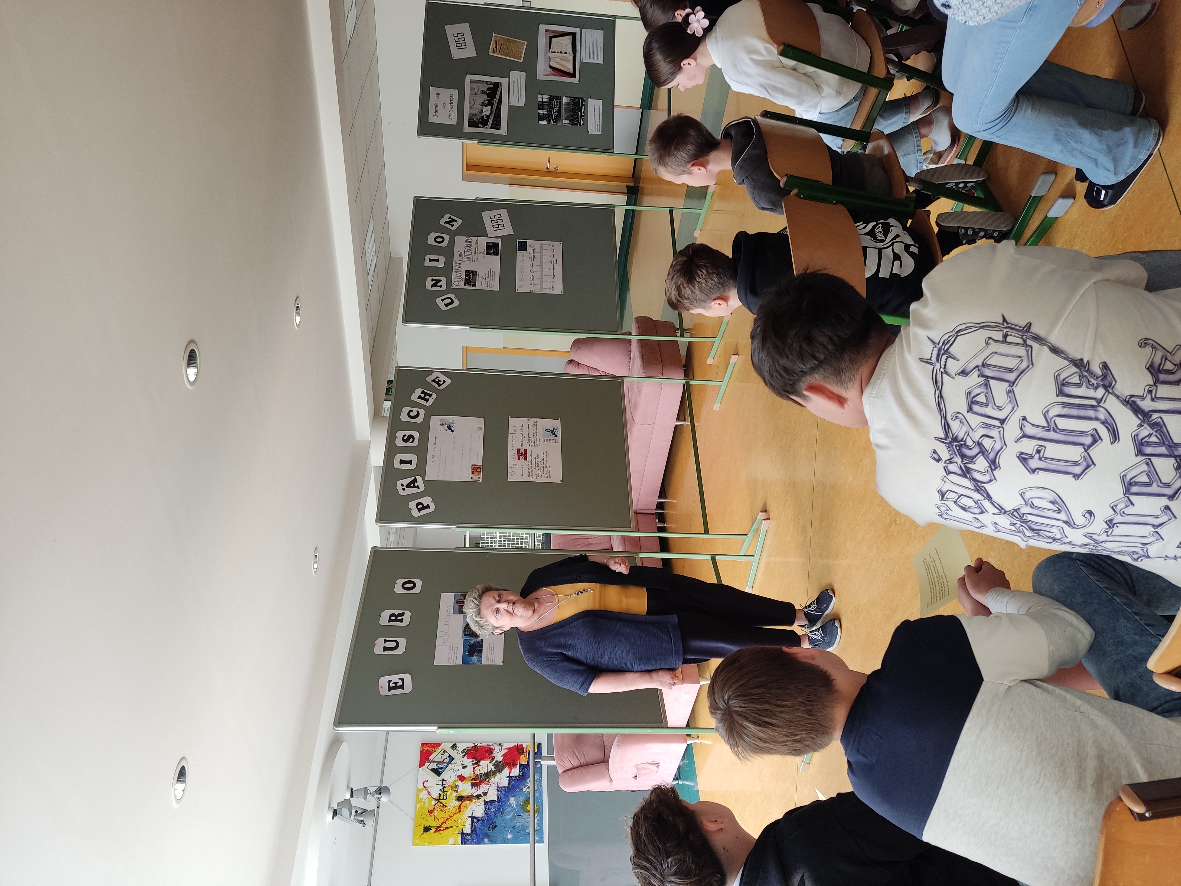 Die Jugendlichen erklärten kurz und verständlich die Ereignisse dieser Zeit, präsentierten aber auch Anschauungsmaterial, z. B. wurde ein Brief der Urgroßmutter eines Schülers gezeigt, in dem sie erfuhr, dass ihr Mann in Stalingrad gefallen war. Außerdem interviewte ein Schüler seine Großmutter über die Zeit nach dem 2. Weltkrieg. Ihr Erlebnis mit russischen Soldaten wurde den Zuhörenden vorgespielt. Gebrauchsgegenstände, die nach dem Weltkrieg aus Rüstungsmaterial hergestellt worden waren, wurden ebenfalls von einem weiteren Schüler hergezeigt.