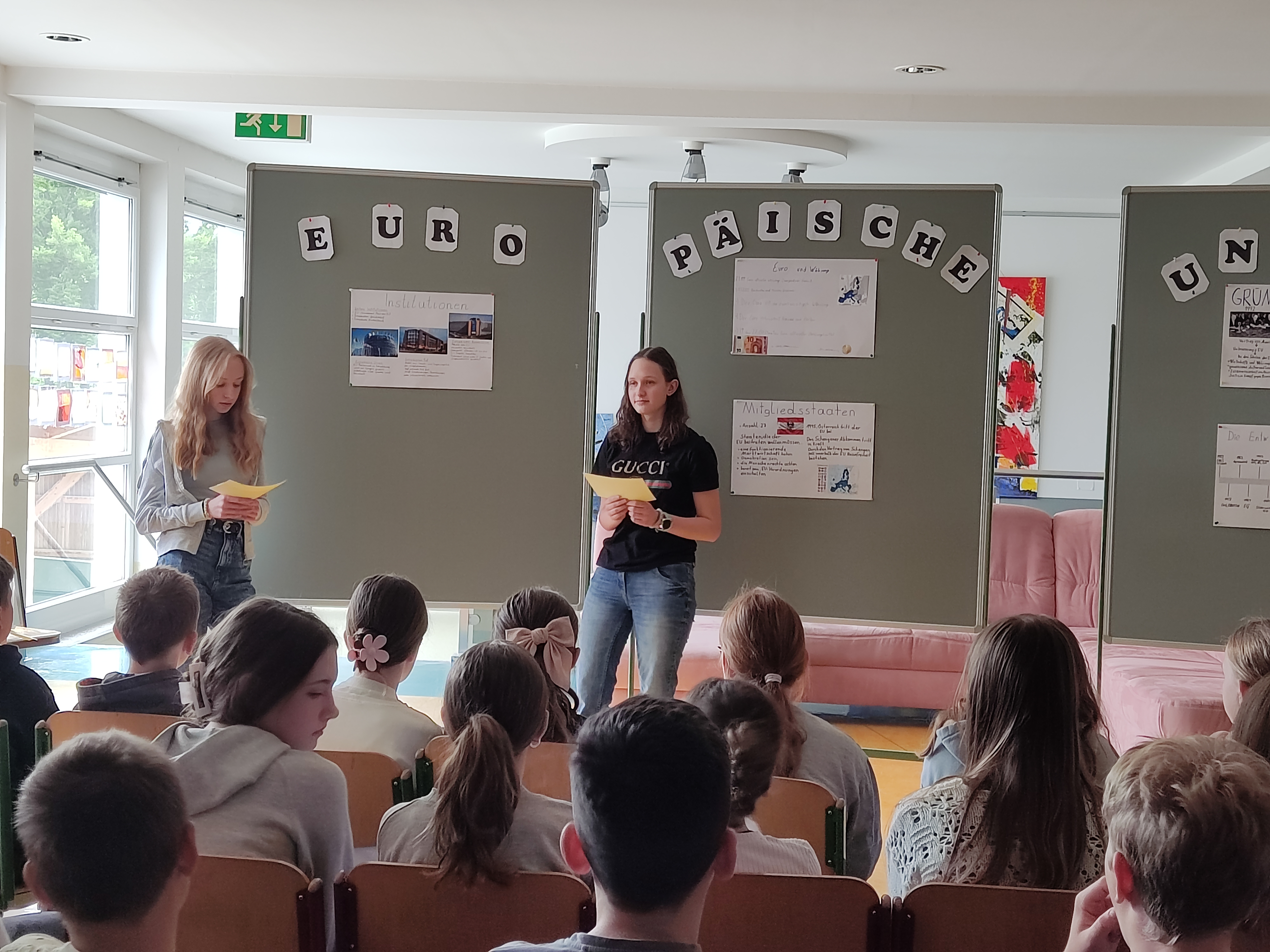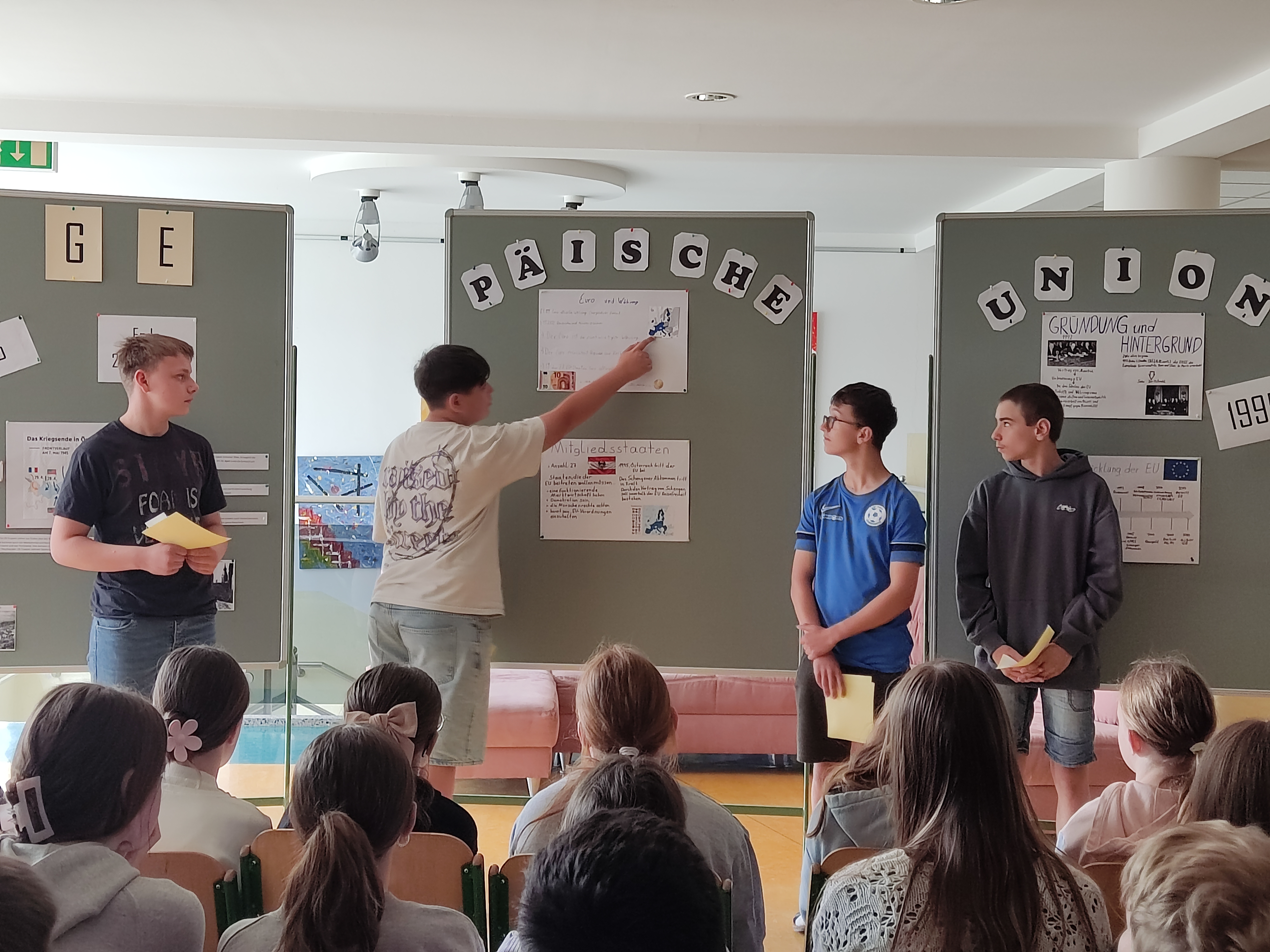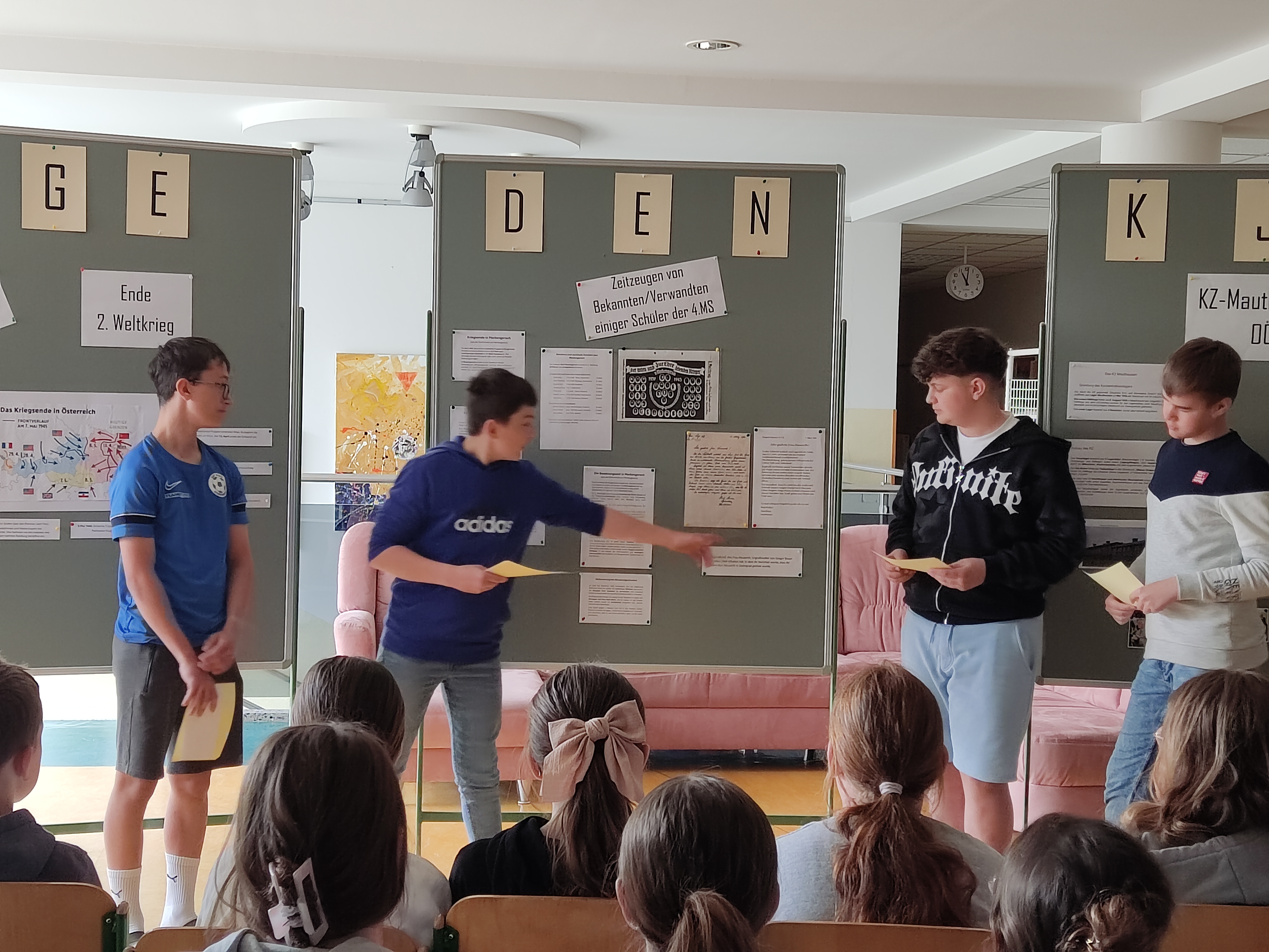 Die Schülerinnen und Schüler der 4. MS beschäftigten sich in den letzten Geschichte- und Geografiestunden intensiv mit dem Ende des Zweiten Weltkrieges in Österreich 1945, mit der Besatzungszeit bis 1955, mit der Unterzeichnung des Staatsvertrages 1955 und dem Beitritt zur EU 1995. Ihre Ausarbeitungen darüber präsentierten sie allen Schülerinnen und Schülern, Lehrern und der Direktorin in der Aula der Mittelschule.