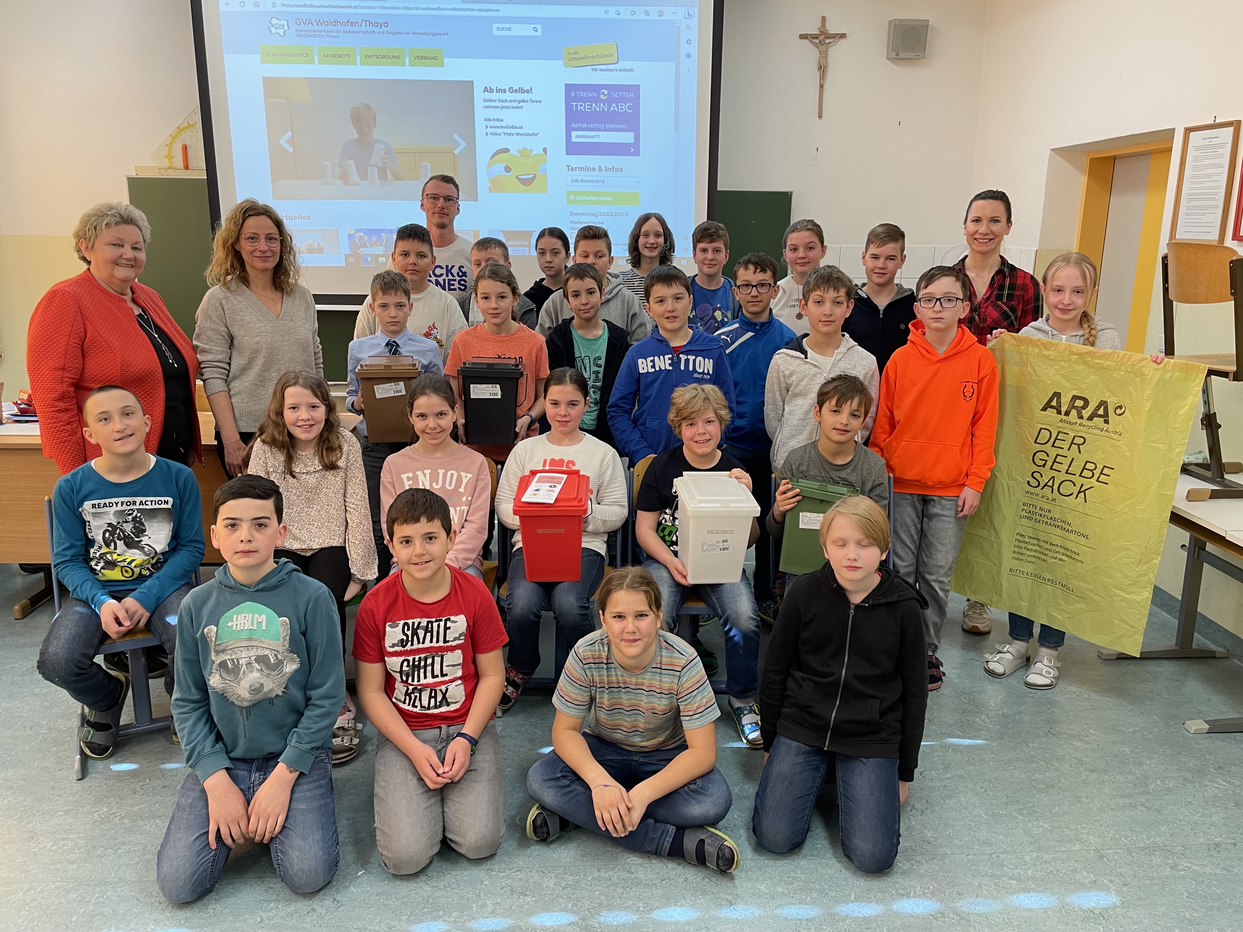 Die Kinder der 1. und 2. Klasse mit Elke Allram, ihren Lehrern Helene Handl und Martin Buchtele sowie Direktorin Anita Fröhlich nach dem Workshop zum Thema richtige Abfallentsorgung.