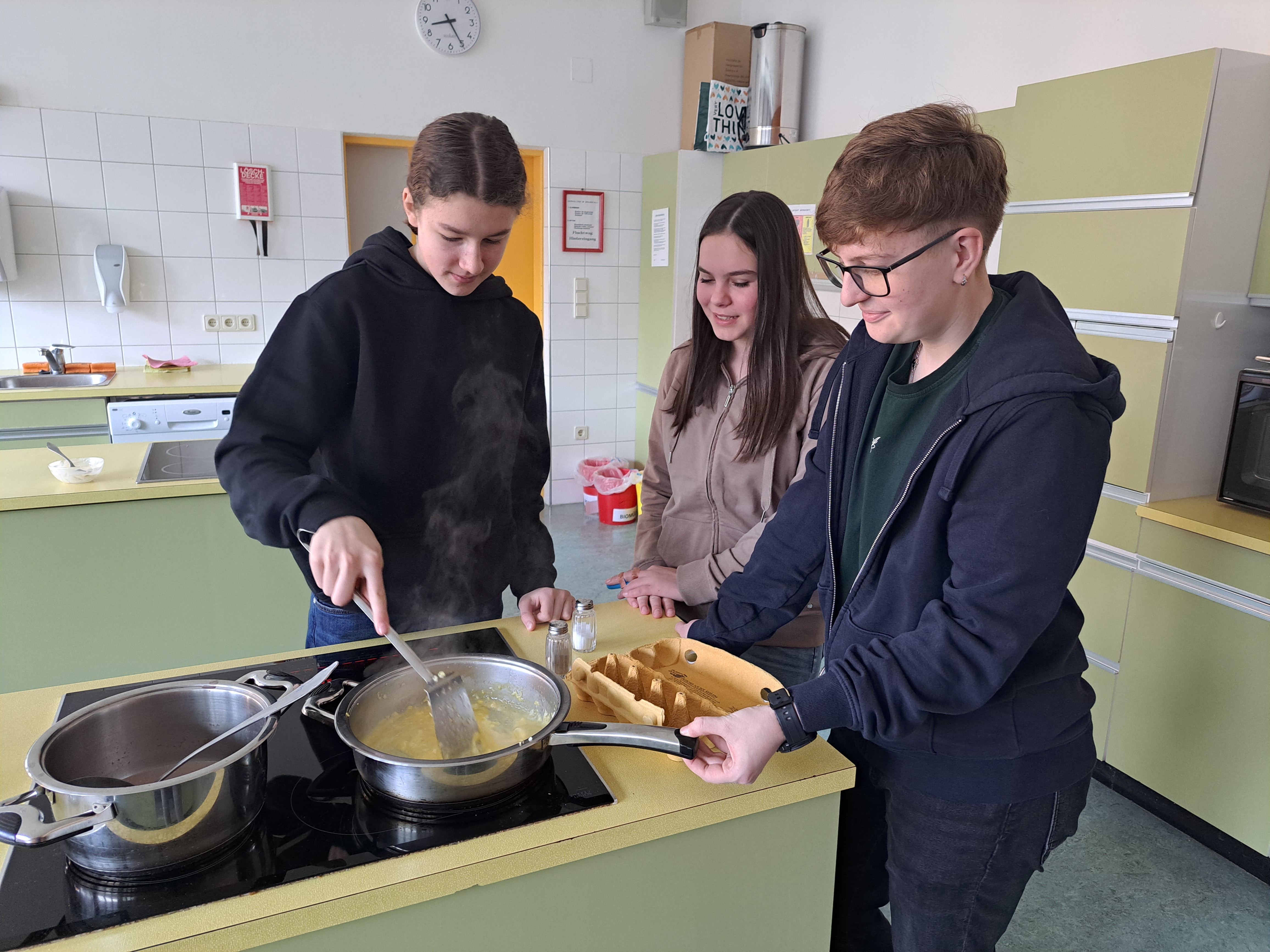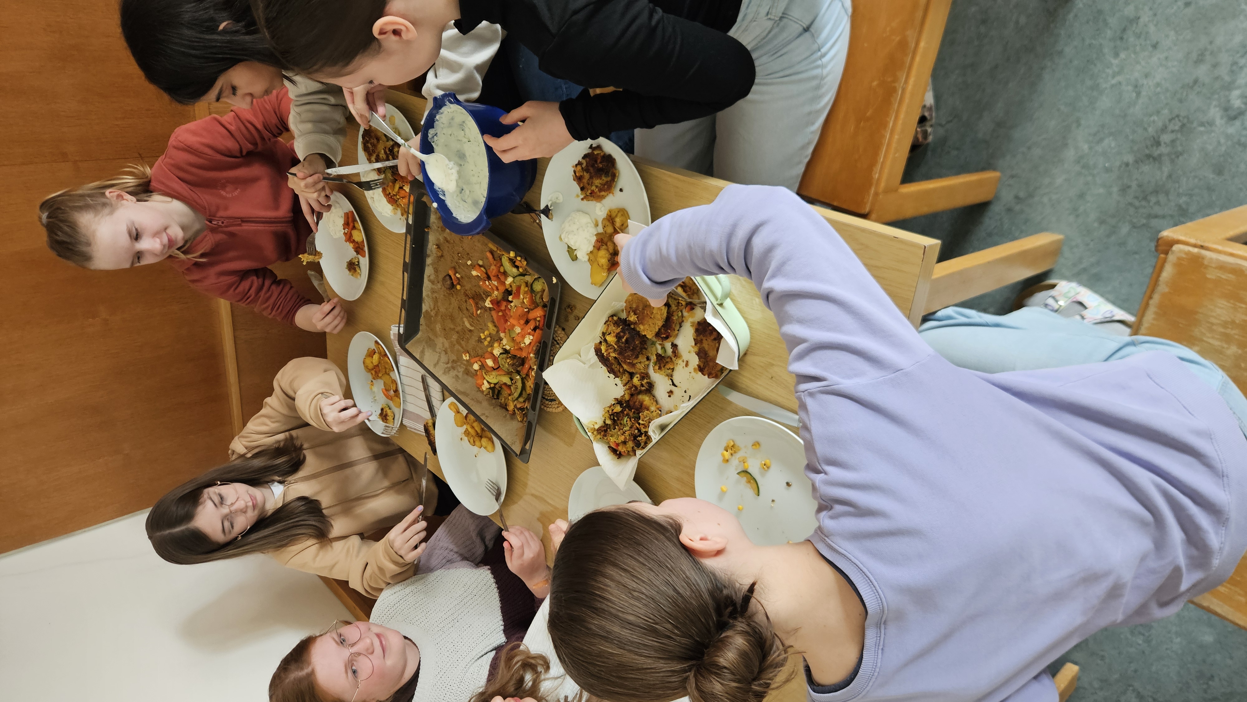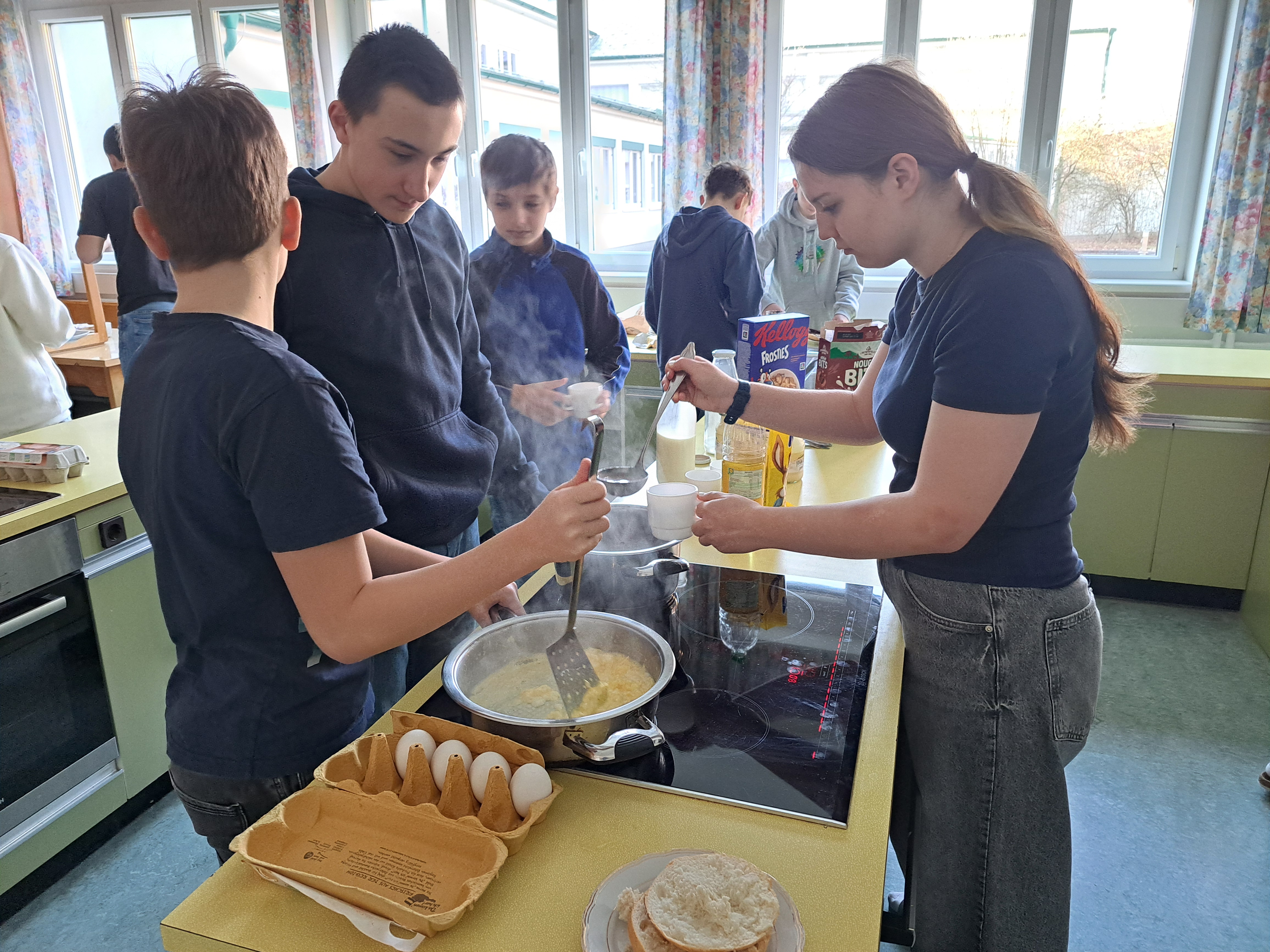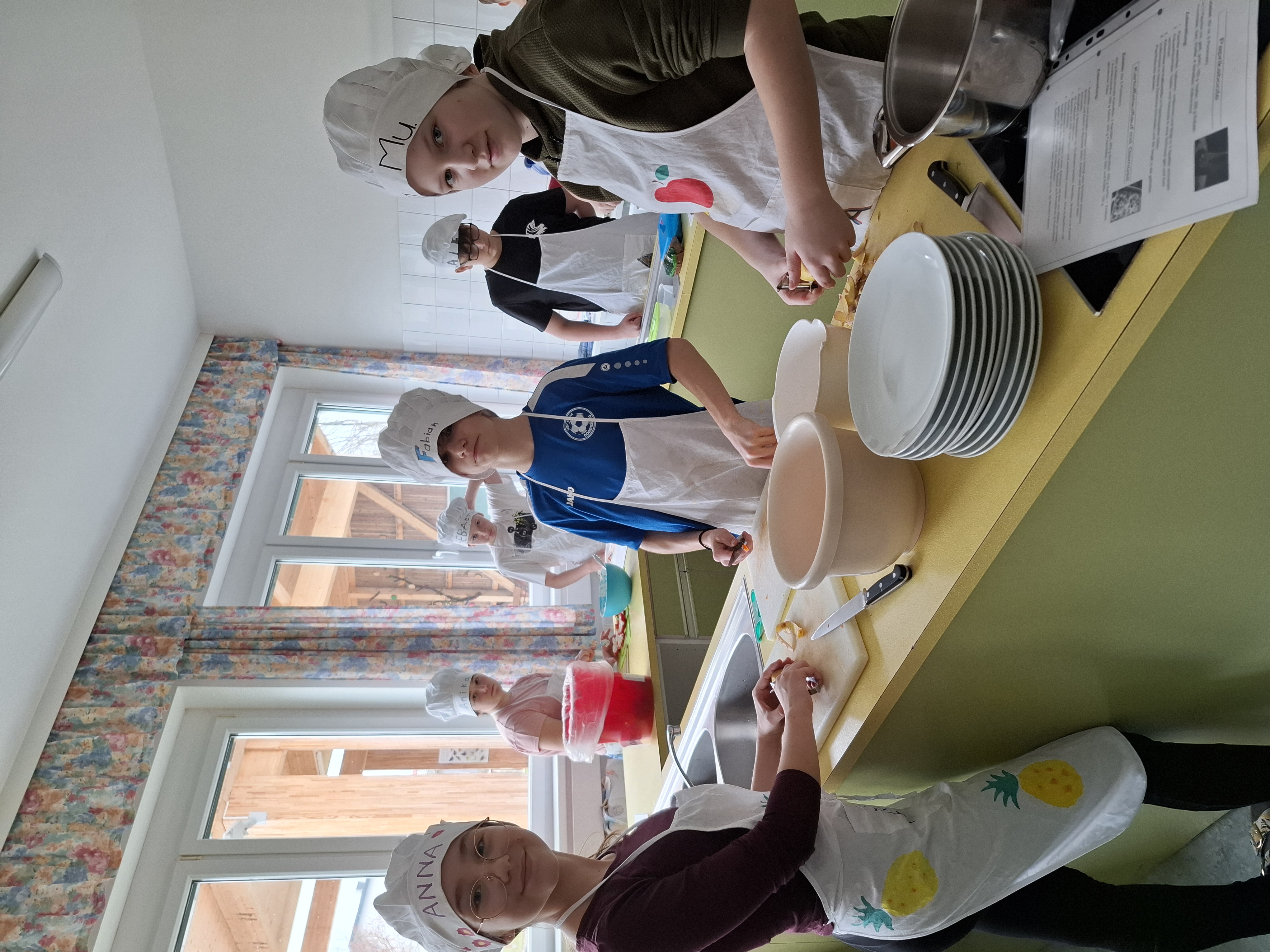 In der Themenwoche gab es für die Kochgruppe 2 der 3. Klasse ein gesundes Menü: Paprikaboote mit Crackern, Gemüseauflauf mit Kartoffeln und Obstspieße.